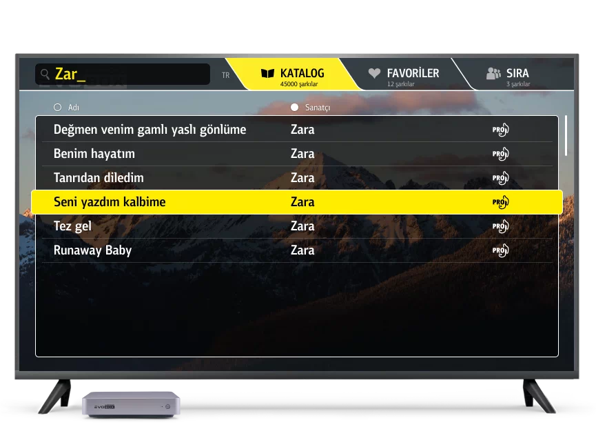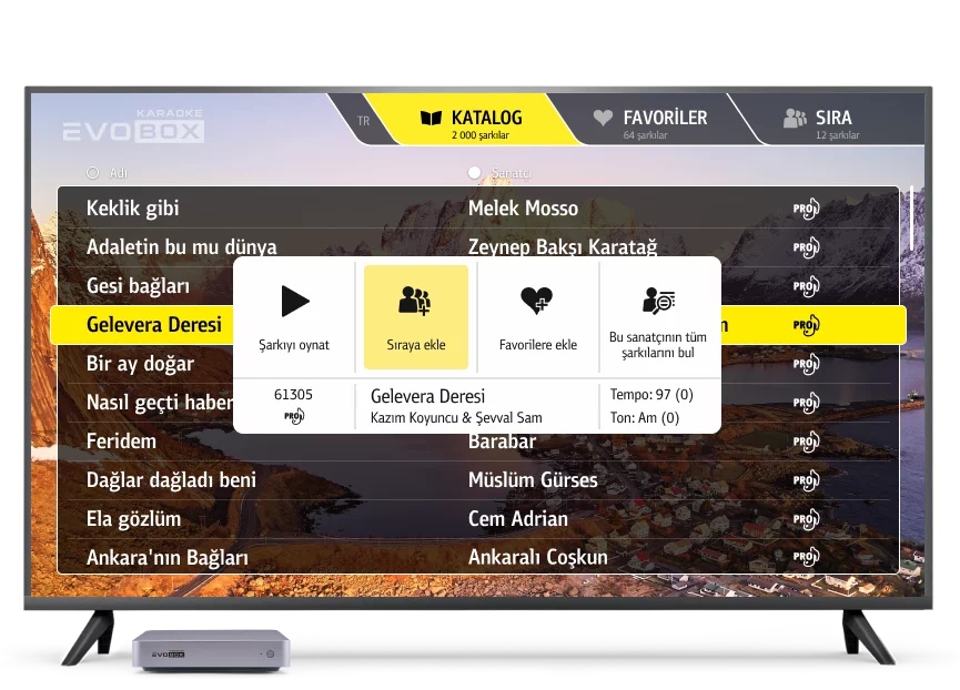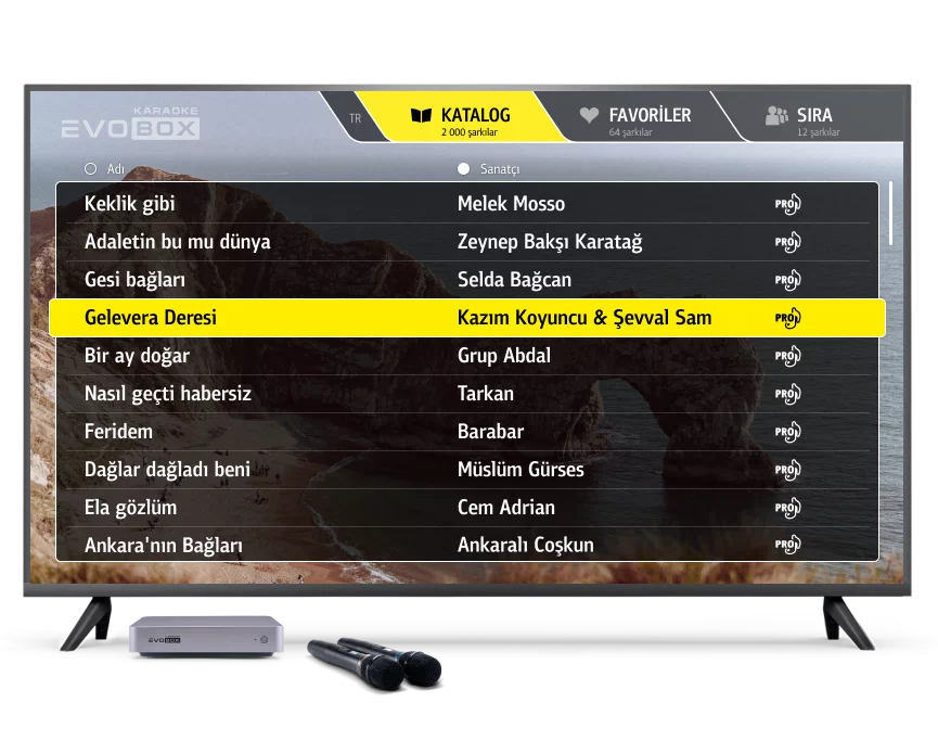 Полный караоке-каталог от Studio Evolution содержит более 80 000 композиций на 20+ языках, в том числе песни на арабском языке и 2000+ турецких песен, и регулярно пополняется новыми хитами. Вы можете приобрести любые песни из полного каталога отдельно.